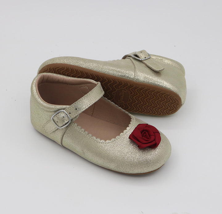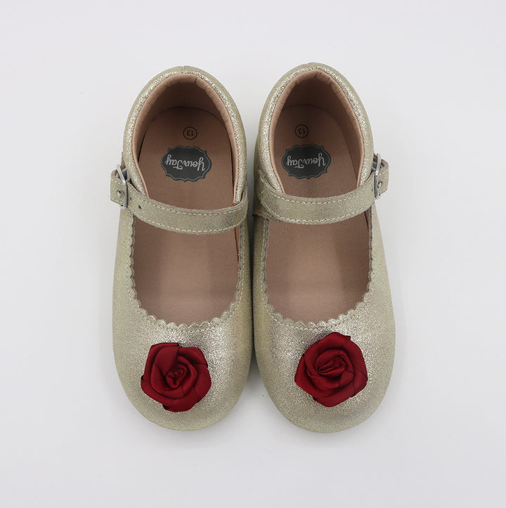 Step into a fairytale with our Belle shoes, designed for little princesses who dream big. These golden beauties suede - shimmer with every step, capturing the elegance of Belle’s iconic gown. The highlight? A silk red rose detail, delicately placed to symbolize timeless beauty and courage. Perfect for magical playdates, special occasions, or simply twirling through the day.